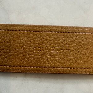Chic Prada belt in tan leather. Color is more yellow. Features a stylish silver buckle. Ideal for any ensemble. Very Good condition with a few scratches on buckle. Vintage and authentic