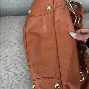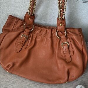 Chic Prada shoulder bag in tan leather. Features elegant gold chain straps. Perfect for stylish outings. A little bit of rubs on metal but overall clean and no tears.