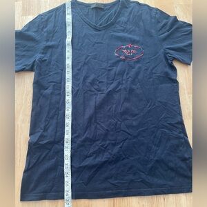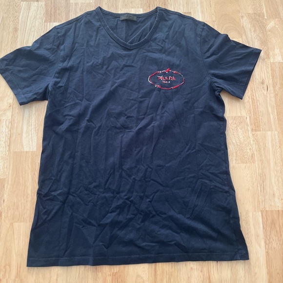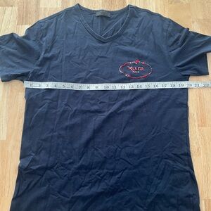Really nice Prada Tee in Navy Blue with the logo embroidered on the chest in their iconic “double vision” style. Size Medium- measurements pictured.