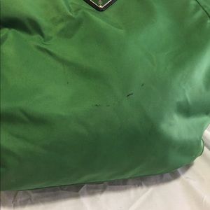 Green tote bag. Nylon material keeps this bag lightweight. Minor imperfection as shown in photo. Discount reflected in current price.