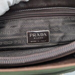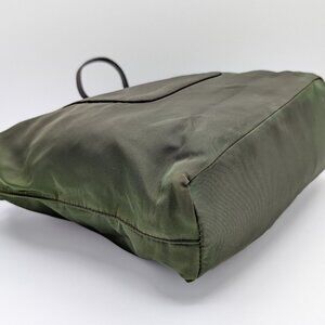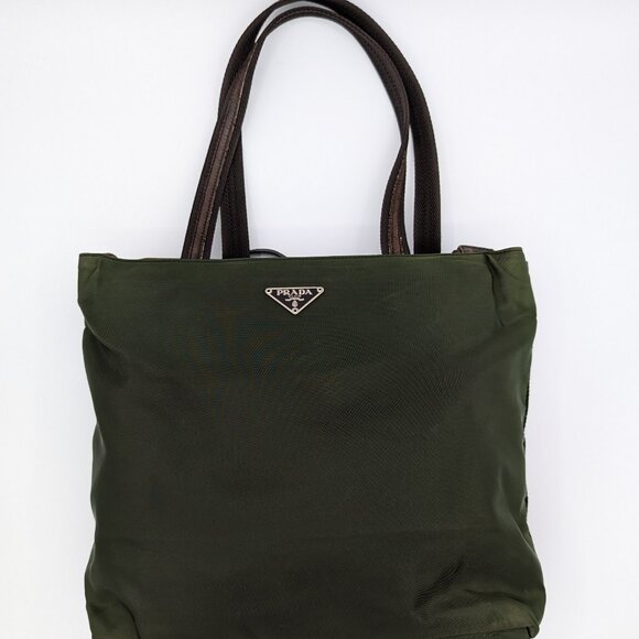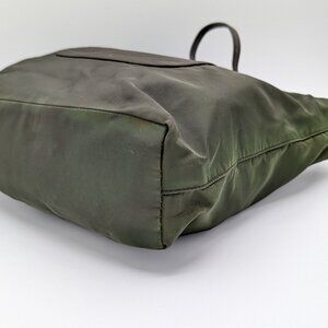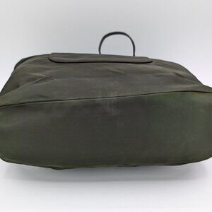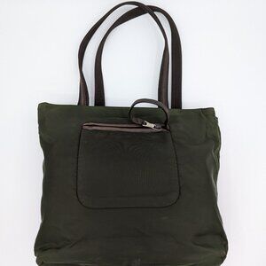 Dark green nylon tote with brown accents. Leather and fabric shoulder straps. Zip pocket at back. Brown jacquard lining. 2 open interior compartments, 1 middle zipper compartment. Additional interior zip pocket. Leather zipper pulls.