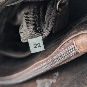 Condition: Fair. Stains and marks throughout for a worn-in vibe. Mild vintage scent. Scratches and wear to leather. Tarnishing to hardware.