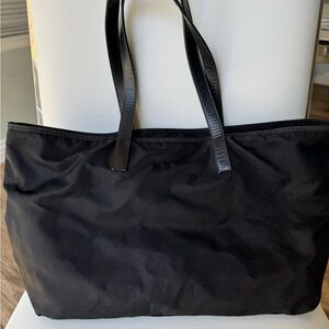 Great preloved condition. Nylon with leather handles. Black with silver hardware. Very clean inside. No rips, tears or smells. Corners are good. A few very light marks on exterior. Zip close. Even has a silver ring on front, perfect to hang your favorite bag charm.