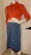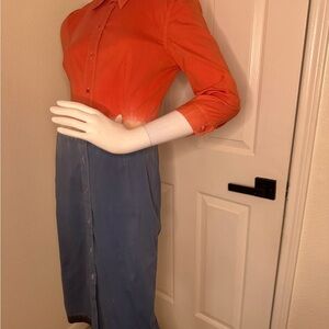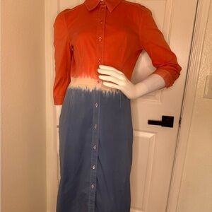 Stylish red and blue ombre dress with button-up front. Features three-quarter sleeves.