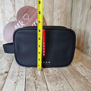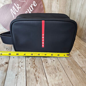 This is a new Prada Toiletry bag, black in color. The bag is made of a smooth, matte black material, possibly nylon or a similar synthetic fabric. It features a top zipper closure, a small interior pocket, and a short, black leather-like handle. The Prada logo is prominently displayed on the front. The bag shows no visible signs of wear or damage; however, it is new without tags or box.