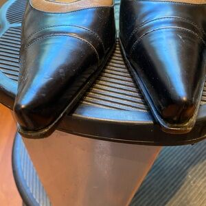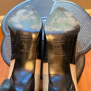Chic Prada pumps with a sleek design. Black and cream color combination. Ideal for stylish outings.