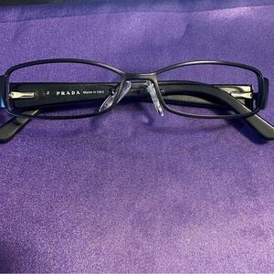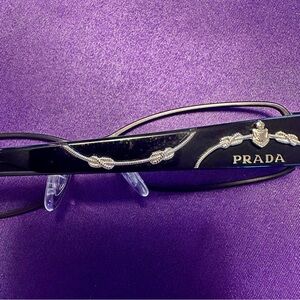 Authentic Prada eyeglass frames, model VPR 58L, in a sleek black finish with elegant silver vine/leaf embellishments along the temples. Made in Italy with high-quality craftsmanship. These frames were used lightly as computer glasses (not for daily wear), so they show some gentle signs of wear. The prescription lenses have been removed, making them ready for your own prescription or sunglass lenses.