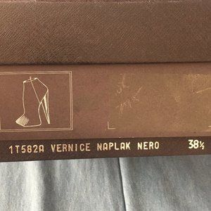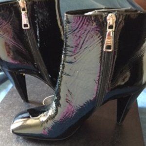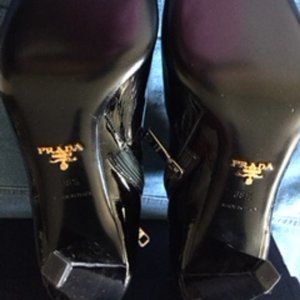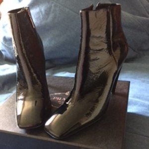 Prada Vernice Naplak Black Patent Leather Ankle Booties, 38.5