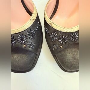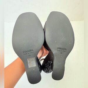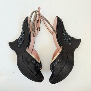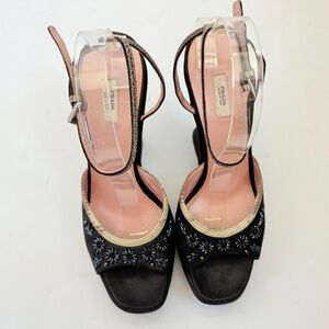 Prada Vintage Black Leather floral Beaded open toe platform Wedge Sandals EU 39