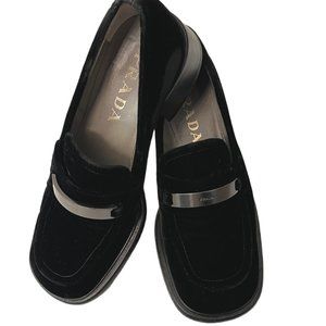 Prada Vintage Black Velvet Chunky Loafers with Metal Logo Size 36.5 US Size 6.5
