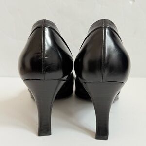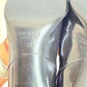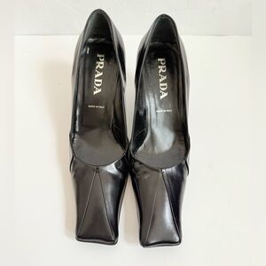 These iconic Prada black leather shoes have the signature square Prada toes, "pleated" leather details, and a 3" heel. We love pumps that have something special that sets them apart! These black shoes can be worn in the day or the evening! These shoes are marked a size 39 and were made in Italy.