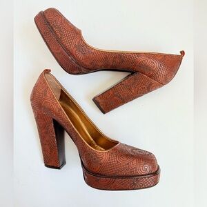 Prada Vintage Brown Leather Floral embroidered chunky heel pumps EU 38.5