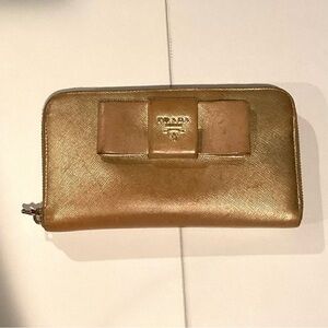 Used Chic Prada wallet in metallic gold. Features a prominent bow detail. Ideal for a luxurious touch. The zipper is functional but it’s a missing a zipper pull.