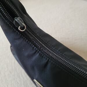 Prada mini bag made with nylon in a hobo style. Featuring zip closure, black woven fabric looping shoulder strap and black lining.