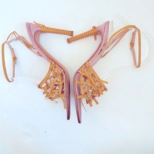 Prada Vintage liliac Gold Satin Leather Bow Caged tie around ankle Heels EU 37