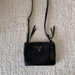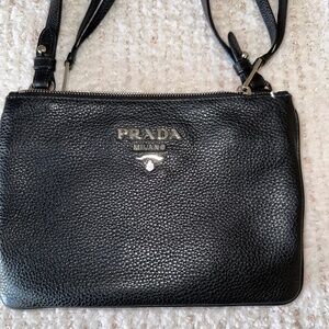 Like new condition. Authentic Prada dual strap double zip Vitello Daino crossbody, size small. Color black calfskin leather, gold hardware.