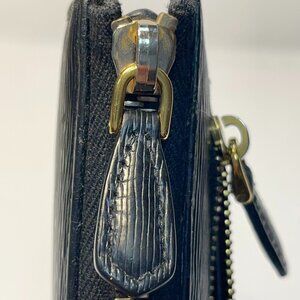 This chic wallet is crafted of Prada signature cross-grain Saffiano leather. The wallet features a 3/4 polished gold wrap-around zipper that opens to a compact compartmentalized black leather interior with card slot panels, patch pockets and a central zipper pocket.