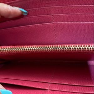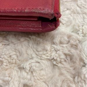 Hot Pink 8 cards 3 cash areas….. coin area dark otherwise inside and out really good condition ❤️ super cute this is preowned expect some wear dirt scratches rubs in piping good condition NO BOX INCLUDED really cute ❤️ Thanks for looking