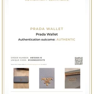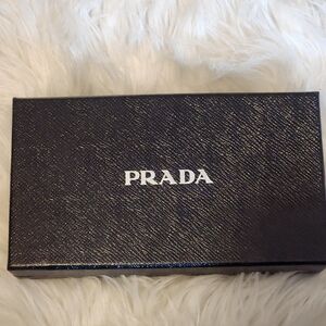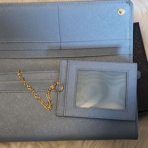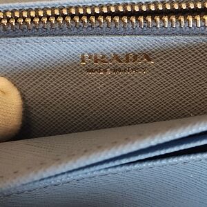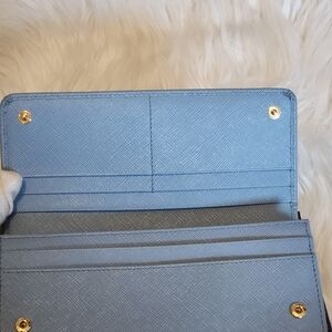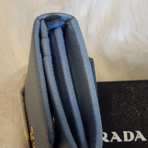 Pretty Blue Prada Wallet. This wallet is spacious with several compartments and a removable license/card hard holder. It matches the Prada Canapa Bag in my closet.