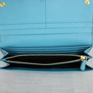 Prada Wallet Clutch Womens Blue Pebbled Leather Snap Zip Pockets Trifold