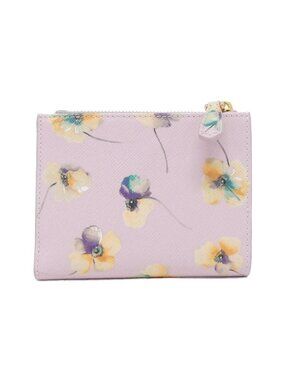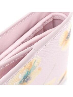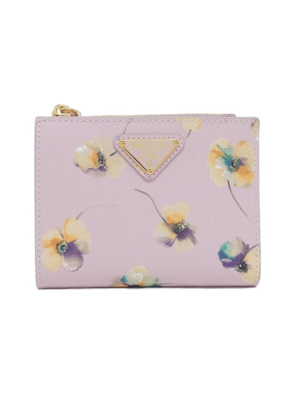 This is an authentic Prada Matinee wallet in Alabastro Gold featuring a Saffiano leather exterior with a delicate floral print design. The compact wallet showcases a triangular gold-tone metal plaque at the center and a top zip closure for secure storage. Measuring 11.5 cm x 9 cm, it's the perfect size for everyday essentials.