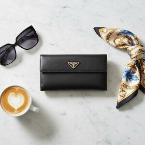 Beautiful. Timeless and functional, this Prada Continental wallet is crafted from Nero Saffiano leather with silver-tone hardware and the iconic Prada triangle logo. Designed with a slim silhouette, it features two snap closures, a roomy exterior pocket for quick access, and a leather-lined interior. Inside, you’ll find 20 card slots, five interior pockets, and space to keep essentials organized in style.