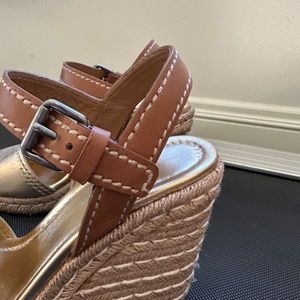 Prada classic wedge sandal, women’s size 40. Gold and brown leather with white stitching on straps. 4.5” height heel. Some dirt on back of right heel.