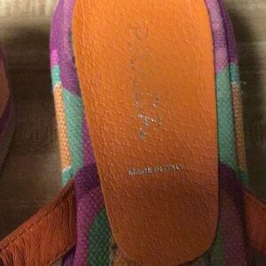 Pretty colorful Prada wedge sandals. Really good shape, some spots on footbed which isn’t seen when worn. Leather orange straps with gold tone decorative studs and rings. The colors are orange, green and two shades of mauve. Comes with Real Authentication certificate.