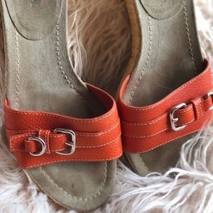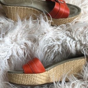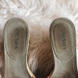 These fairly worn Prada wedges are still a staple for anyones collection. Wedge is completely in tact, the leather is worn or faded at all, with still brilliant orange vibrancy. They are perfect for everyday wear in the spring and summertime.