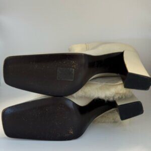 Authentic Prada tall boots in supple white leather with chic fur trim detail at the top. Designed with a square toe, block heel, and full slip-on shaft. Statement boots perfect for winter fashion or collector’s closets.