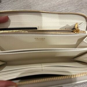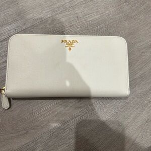 Elegant Prada wallet in white leather. Features a zip-around closure. Comes in original box.