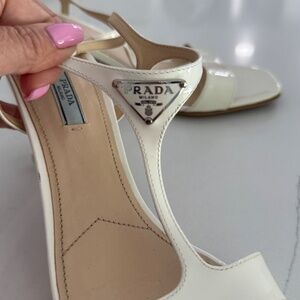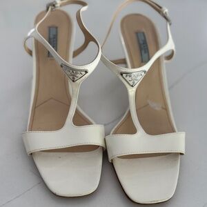 Prada White Patent Leather T Strap Sandals Cocktail Workwear Evening