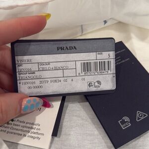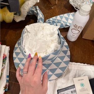 Elegant Prada blue and white visor w/ dust bag with iconic logo. Crisp fabric. Sz Small, but has a stretchy back band fits a size medium. I’m typically a 7 & 1/8th in cowboy hats and this visor is a little big on me. Has a tiny bit of tinted sunscreen on inside visor. Worn twice.