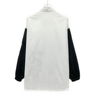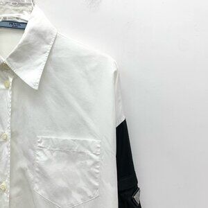 White cotton button-up long-sleeve shirt with signature triangle logo patch