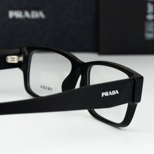 Prada PRB09V 12P1O1 eyeglasses present a refined rectangular silhouette in matte black acetate, designed for both men and women. The clear, customisable lenses allow for easy prescription adaptation, while the full-rim construction ensures durability and comfort. With their sleek lines and timeless design, these frames deliver Pradaโs signature elegance for everyday wear.