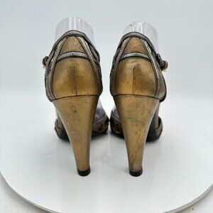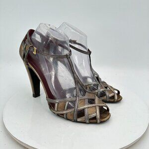 Prada Women Size EU 40.5 US 10.5 Silver Brown Metallic T Bar Buckle Heel Sandal