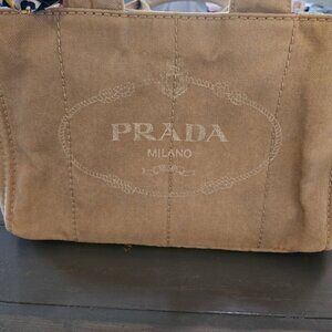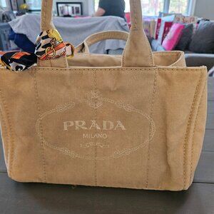 Authentic Prada Canapa bag in grea condition! 8/10 The larger size of the bag The Prada logo print is vivid. The corners are all in good condition. no stains, Free of fraying/pulls/tears and the structure is beautiful! Twilly included but can be removed if not your style