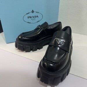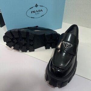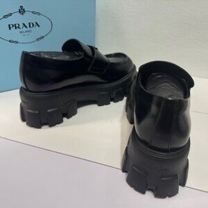 Step out in style with these sleek black loafers from Prada. Perfect for any occasion.