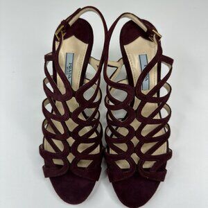Prada Women's Burgundy Open Toe Strappy Wedge Metallic Sandal EU 37.5 / US 7