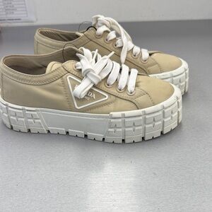 Elevate your look with Prada's cream platform sneakers. Stylish and comfortable for everyday wear.