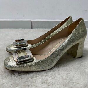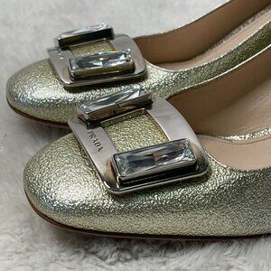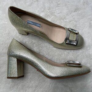 Prada Women's Gold Patent Leather Block Heel Pumps Slip On Shoes Size 38.5