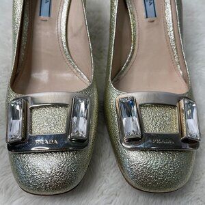 Pre-owned authentic Prada Women's Gold Patent Leather Block Heel Pumps Slip On Shoes Size 38.5. Heel is 2.5" inches. Has some scuffing. Has a micro hole. Please look at pictures for better reference. Let me know if you have any other questions. Happy Shopping! NAPR25. Z13