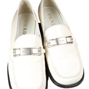 Prada loafers, leather shoes, vintage footwear, women's shoes, slip-on loafers, silver buckle, off-white shoes, designer footwear, fashion shoes, luxury loafers, classic shoes, elegant shoes, Prada logo