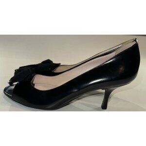 The Prada Women's Open Toe Classic Pumps in black patent leather, size 6, are stylish and elegant heels perfect for any occasion. Made in Italy with a kitten heel and medium width, these shoes feature a solid pattern and classic design that exudes sophistication. The open toe adds a touch of glam, making these pumps a versatile and timeless addition to any woman's shoe collection. Made by the renowned brand PRADA, these shoes are sure to make a statement wherever you go.