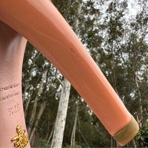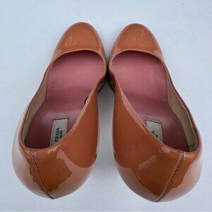Prada Vero Cuoio pumps EU 37.5 / US 7, these pump heels have a round toe, salmon pink color, stiletto heel and timeless style. Material, Vero Cuoio, patent leather upper, leather insole and leather bottom. Condition is preloved good with minimal wear to soles, small heel scuffs/nick and minor discoloration to back from storage as shown in photos. Prada does runs a half size small. Please preview measurements to ensure fit. Heels will be shipped USPS priority mail box and will be bubble wrapped and boxed to protect them during transit. Photos taken in natural light and LED to show true color.
