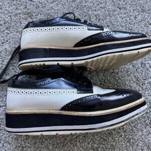 Step up your shoe game with these authentic Prada platform oxfords, perfect for adding a chic touch to any outfit. These black leather shoes feature elegant accents and a semi-pointed toe, combining luxury design with comfort.