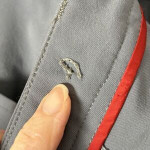 Flaws: Small faded area right front leg, missing interior button, metal staple on plastic interior label