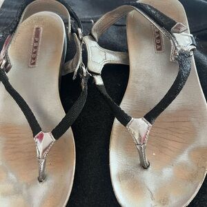 Elegant Prada sandals with a sleek black and silver design. Perfect for adding a touch of luxury to any outfit.