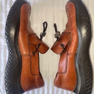 90s style Prada women’s loafer in a beautiful saddle color. The attention to detail is so impressive in this shoe and they are in great shape. I bought these in Italy when I was working in the shoe industry. They are in beautiful shape with the Prada Vibram sole which is so durable. This style is from when Prada first started production with Vibram. The toggles (with the Prada embossed on them) are a bit worn but for a 30 year old shoe they look great and work fine. There is a scratch on the back end of the outside of the left shoe (shown in pics). Other than that, these girls are perfect. They are a size 39. I wear a nine and they fit me fine. They are a normal width. Not for a wide foot.
