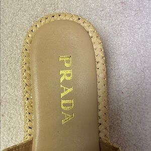 Step into style with these Prada woven slide sandals. Featuring a chic tan color, these sandals are perfect for any casual outing. Enjoy the comfort and elegance of Prada.